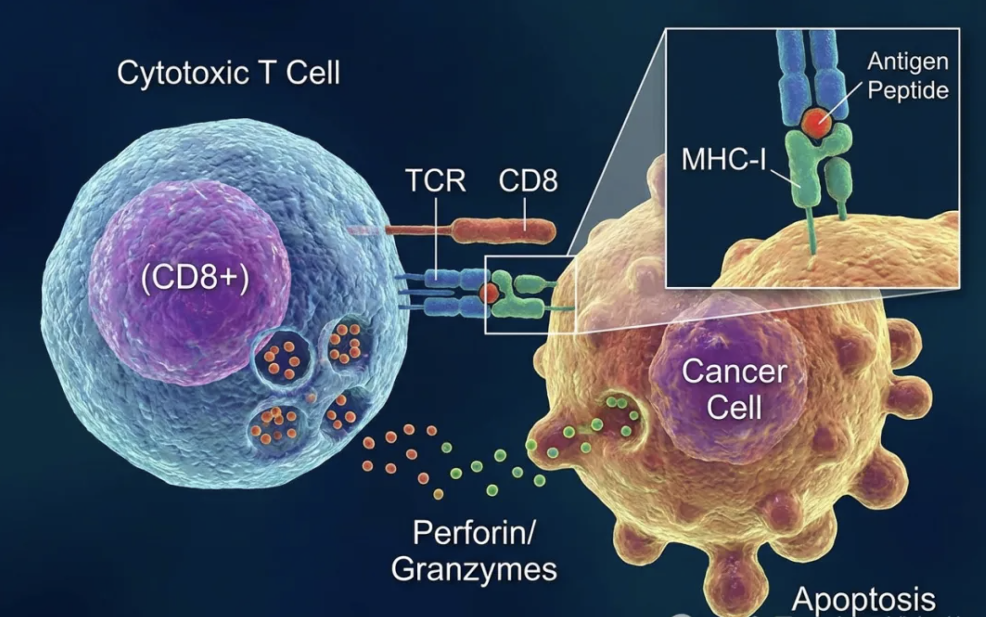 你告诉它:“画一个T细胞识别并杀伤癌细胞的过程,要体现MHC-I类分子呈递抗原的细节。”
