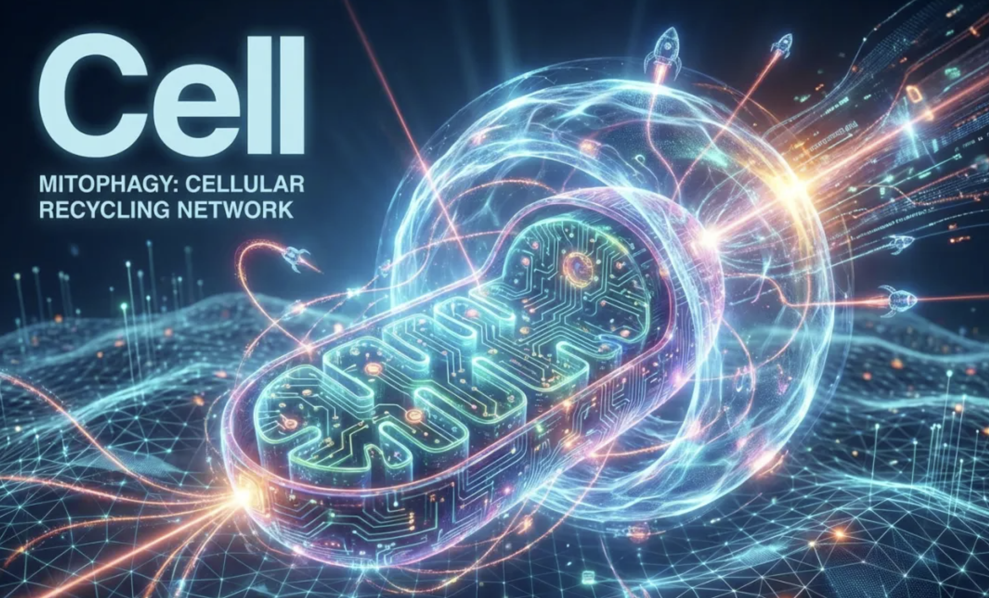 指令: “生成一张用于《Cell》期刊封面的图片,主题是‘线粒体自噬’,风格是炫光科技风,要有动态感,体现线粒体被自噬体包裹的过程。”