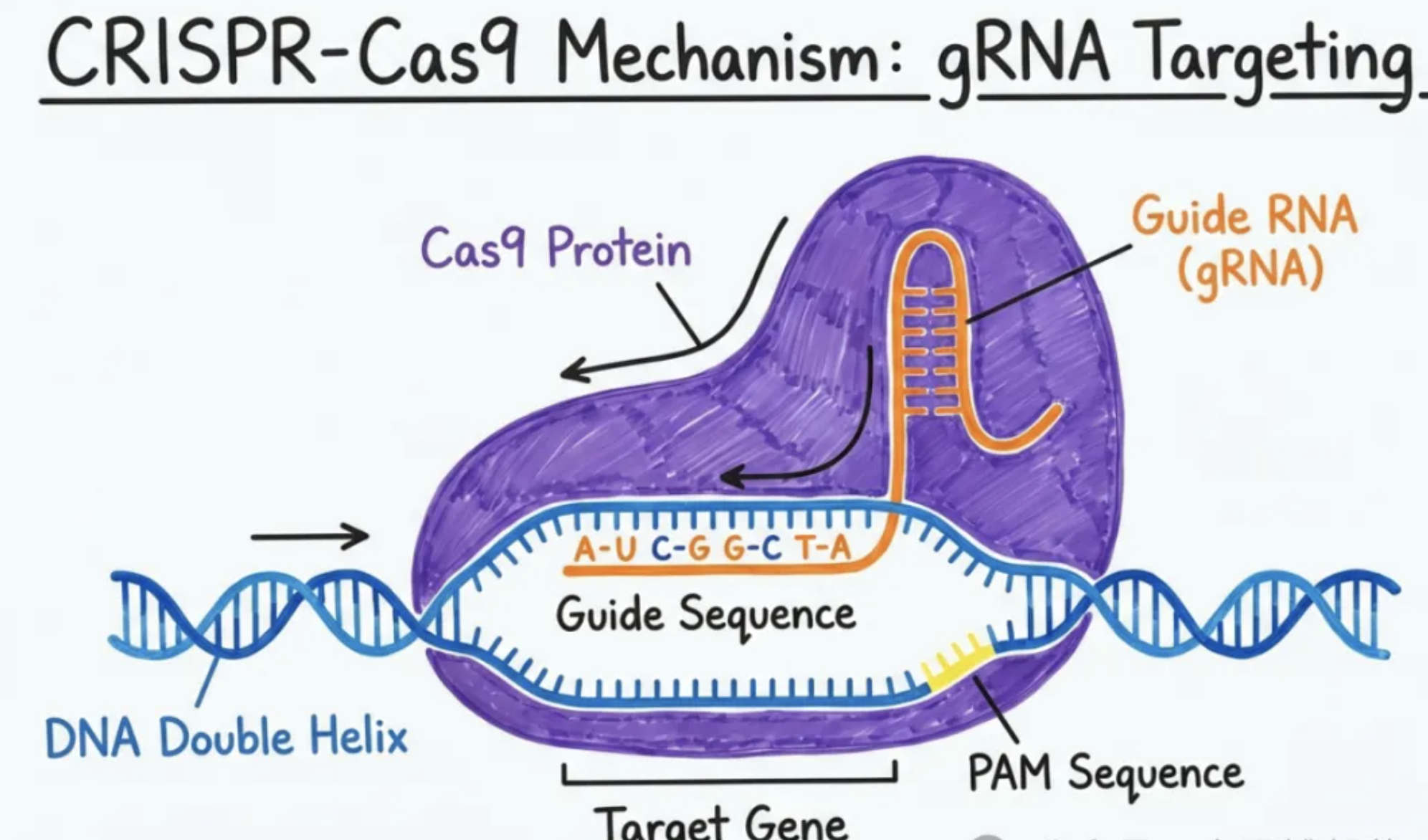 指令: “画一个示意图,解释CRISPR-Cas9基因编辑技术中‘向导RNA’如何定位到特定基因序列。”