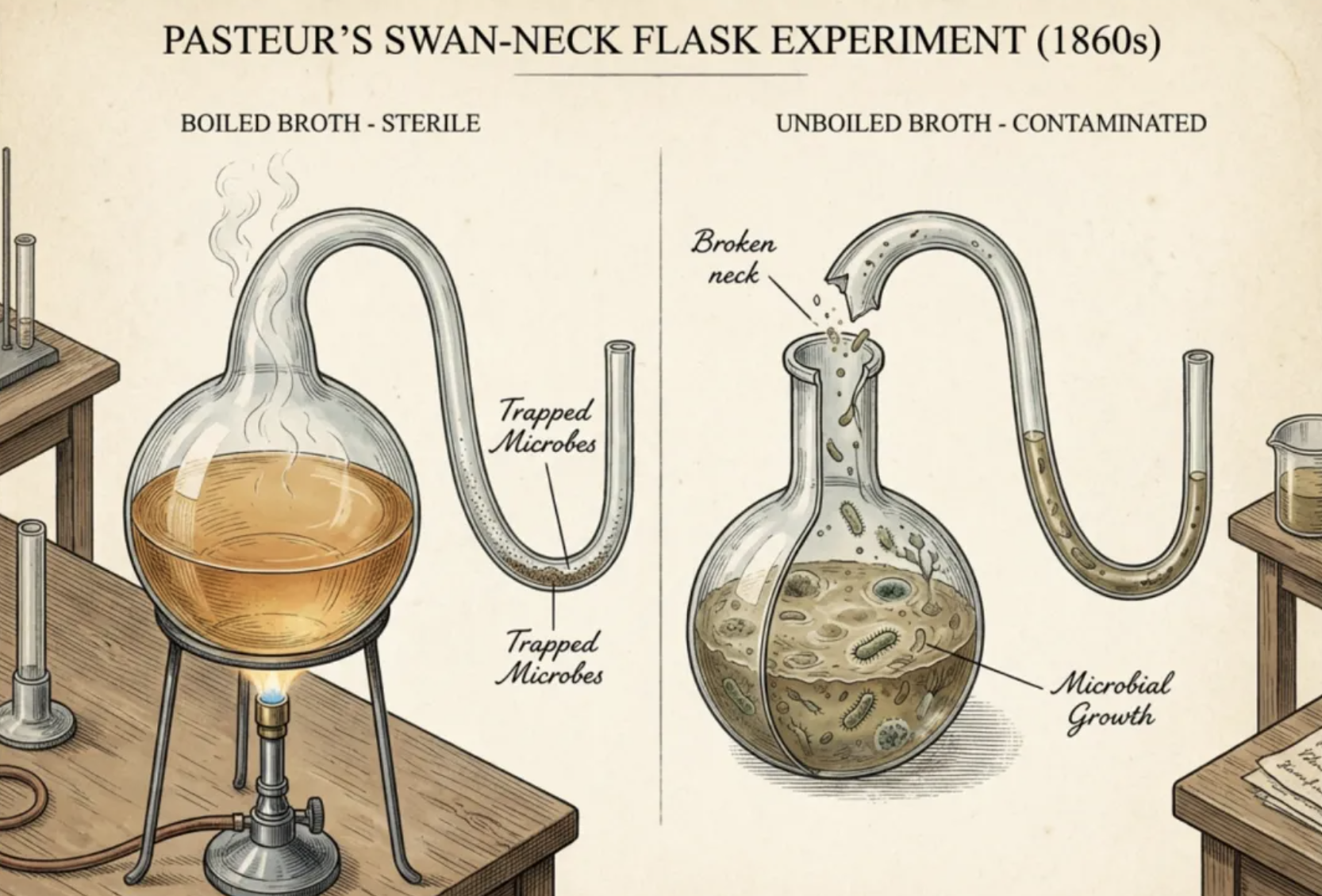 指令: “生成一张19世纪巴斯德鹅颈瓶实验的等距剖面图,展示煮沸的肉汤和未煮沸肉汤的对比,风格写实。”