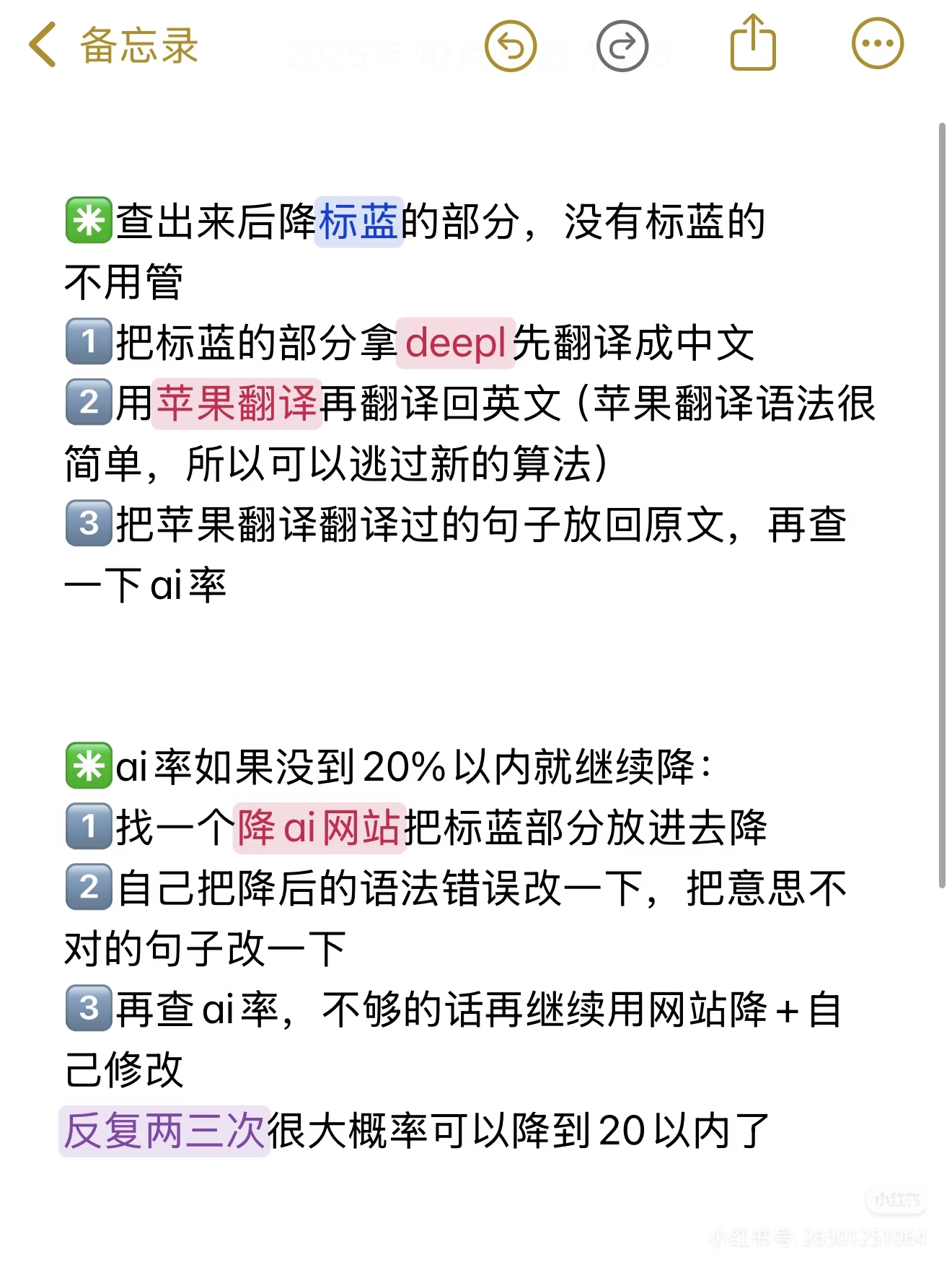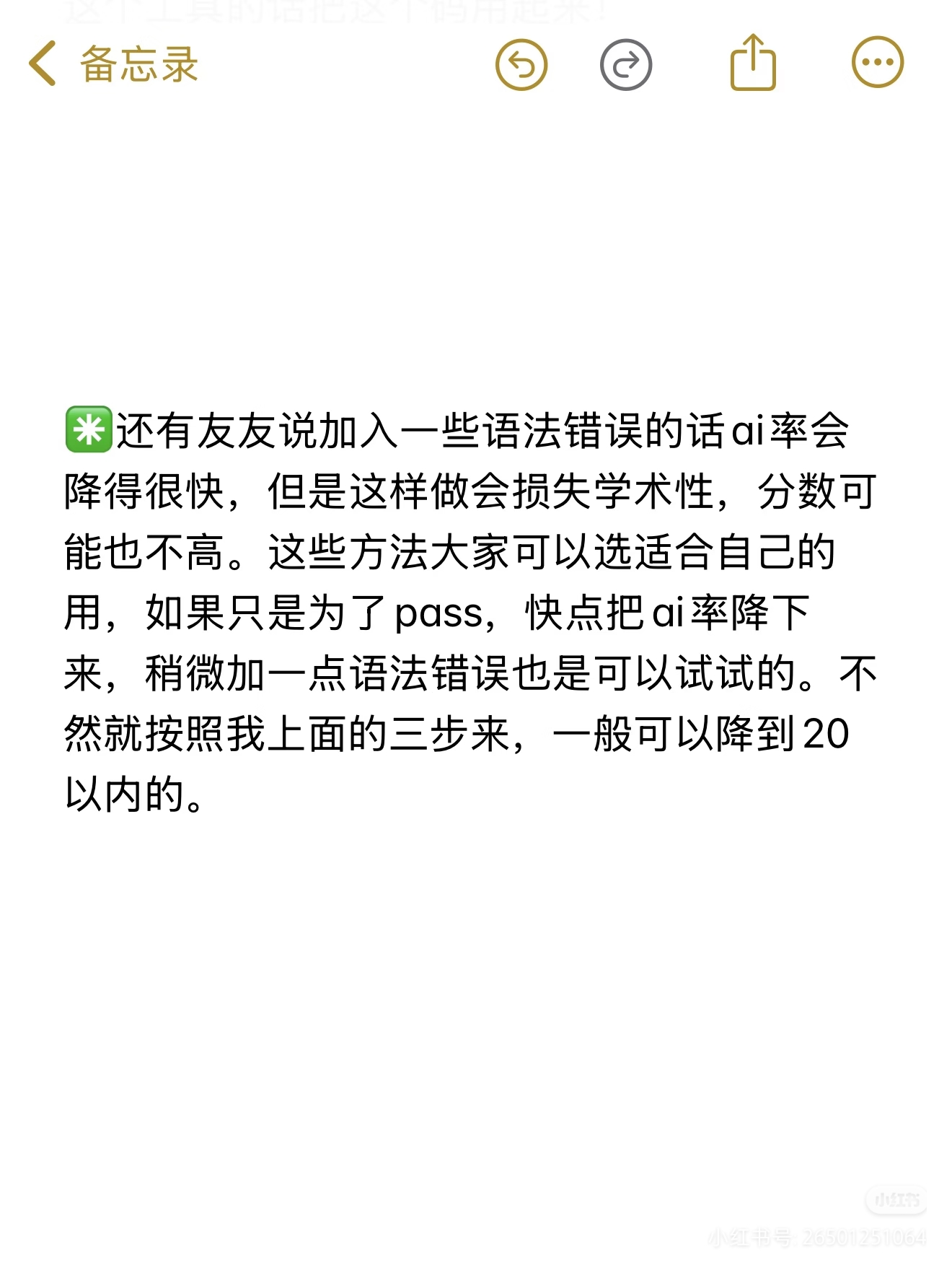 有用户提到加入一些语法错误可快速降低AI率,但该方法会损失学术性,可能导致分数不高;可根据自身需求选择方法:若仅为了通过(pass),可尝试添加少量语法错误,否则按照之前的步骤操作,一般可将AI率降到20以内。