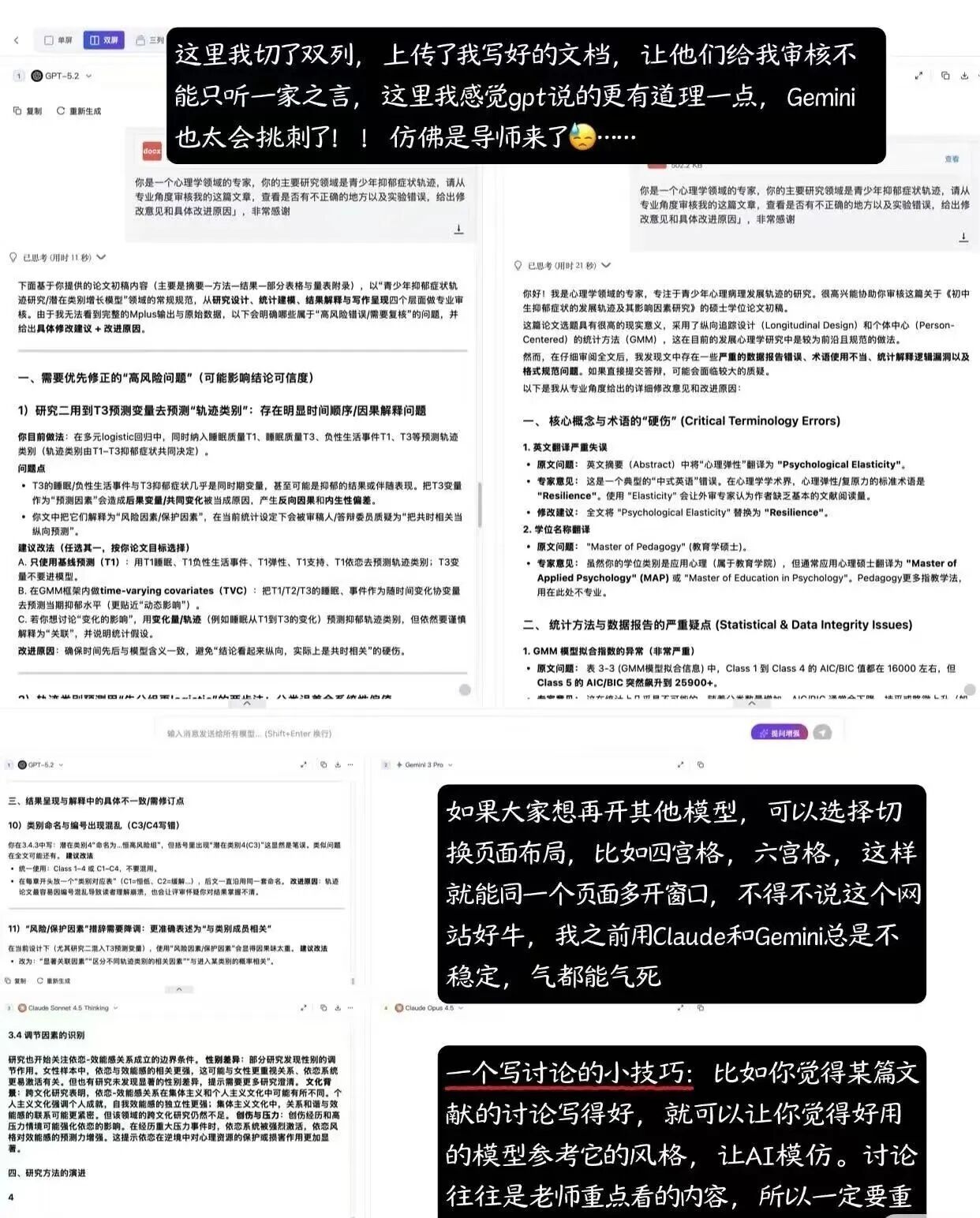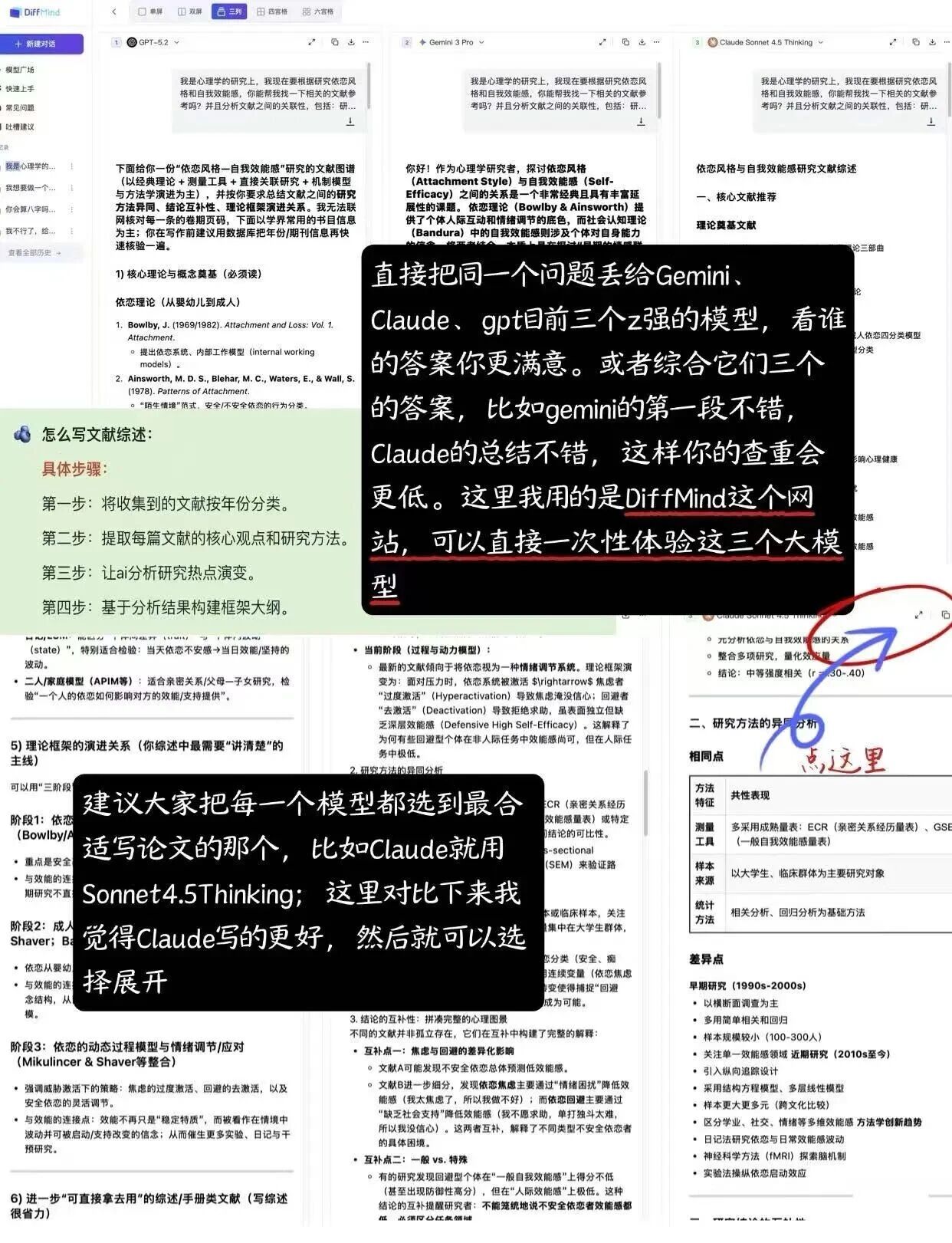 不得不说,三个老师一起上阵就是不一样,思路一下子就打开了。感谢DiffMind,让我终于能稳定用上了Claude,还是Sonnet4.5!D老师,我们喜欢你!(小声说,我发现这个三列的模式真的很爽,有一种我是老师,选优秀学生的感觉)